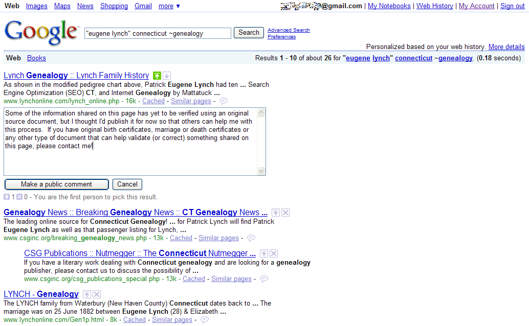 I think my Second Edition of Google Your Family Tree will have to be at least 700 pages because every time I do a search, I notice yet another new feature of Google that genealogists will love (including me)! There are plenty of reasons that you may have chosen up to this point to have a Google Account, but if you haven't then this may finally be the feature that puts you over the edge. The new SearchWiki announced and launched today by Google is a clever way to provide each user with customized search results. As genealogists, we often conduct similar searches based on the surname or place name we are researching. Even with careful filtering, there are probably sites that you see in your search results often, but know from past experience they are not of interest for one reason or another. Well — now you can do something about it once and for all!